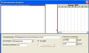 Открываем окно Ресурсы, нажимаем Редактировать ресурсы, вводим название ресурса, стоимость за единицу, единицу измерения и устанавливаем тип ресурса – «Оборудование»