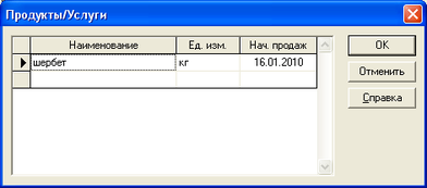 Список продуктов – шербет, кг, начало продаж – 16.01.2010г.