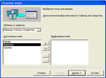 В списке Доступные поля будут перечислены поля, содержащиеся в ранее созданной вами Таблице. Чтобы перенести поле в список Выбранные поля, выделите его в списке Доступные поля и нажмите кнопку со стрелкой вправо. Нажатие кнопки с двойной стрелкой вправо перемещает все поля в список Выбранные поля. Если вы включили поле в форму по ошибке, выделите его в списке Выбранные поля и нажмите кнопку со стрелкой влево. После выбора полей из одной таблицы или запроса можно с помощью поля со списком Таблицы и запросы изменить имя источника данных и продолжить выбор из другого источника, связанного с первой таблицей.