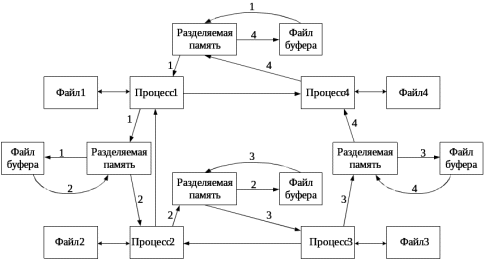 Процессы между собой будут обмениваться через разделяемую память и временный (буферный) файл.
