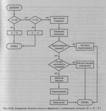 Если результат вычислений в равной степени отличается от большего и меньшего числа, представимого в данном формате, значение округляется до большего, если младший представимый разряд до округления равен 1, и до меньшего, если этот разряд равен 0. Следующие два метода, упоминаемые в стандарте, — округление до плюс минус бесконечности — применяются при реализации методики вычисления, известной под именем "арифметика интервалов", которая предусматривает определение границ (верхней и нижней) значений результата. Последний способ, оговоренный в стандарте, предусматривает округление до. Фактически этот способ предполагает усечение результата — дополнительного разряды просто отбрасываются. При использовании этого способа хранимый. Результат по абсолютной величине будет всегда меньшим или равным точному значению, а потому при выполнении длительных вычислительных процедур образуется смещение в сторону меньших значений (к нулю). Эффект накопления и ошибки округления может быть значительно более серьезным, чем той, которую мы упоминали чуть выше, поскольку смещенная ошибка возникает при исполнении каждой операции, а не только в особых случаях.
