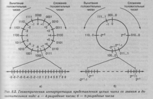 Геометрическая интерпретация представления целых чисел со знаком в дополнительном коде: а)- 4-разрядные числа, б)- n-разрядные числа.