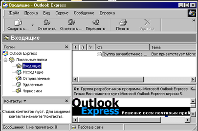 Программа Outlook Express входит в состав Windows 98. При запуске программы Outlook Express обычно начинается уже знакомый вам процесс соединения с удаленным компьютером провайдера и считывание с него предназначенной вам почты. Однако, при отказе от соединения программа переходит в автономный режим работы, который может использоваться для просмотра ранее полученных сообщений, подготовки новых документов и так далее.