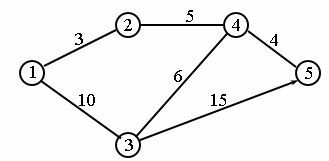 Пример. Найдем для сети, показанной на рисунке 4, кратчайшие пути между любыми двумя узлами. Расстояние между узлами этой сети проставлены на рисунке возле соответствующих ребер. Ребро (3, 5) ориентированно, поэтому не допускается движение от узла 5 к узлу 3. Все остальные ребра допускают движение в обе стороны: