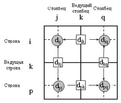 Поясним действия, выполняемые на k-м шаге алгоритма, представив матрицу Dk-1 так, как она показана на рисунке 3. На этом рисунке строка k и столбец k являются ведущими. Строка i - любая строка с номером от 1 до k - 1, а строка p - произвольная строка с номером от k + 1 до n. Аналогично столбец j представляет любой столбец с номером от 1 до k - 1, столбец q - произвольный столбец с номером от k + 1 до n. Треугольный оператор выполняется следующим образом. Если сумма элементов ведущих строки и столбца (показанных в квадратах) меньше элементов, находящихся в пересечении столбца и строки (показанных в кружках), соответствующих рассматриваемым ведущим элементам, то расстояние (элемент в кружке) заменяется на сумму расстояний, представленных ведущими элементами: