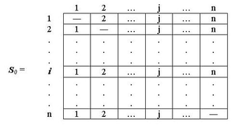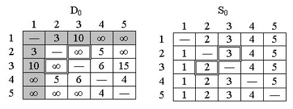 Определяем начальную матрицу расстояния D0 и матрицу последовательности узлов S0. Диагональные элементы обеих матриц помечаются знаком "-", показывающим, что эти элементы в вычислениях не участвуют. Полагаем k = 1: