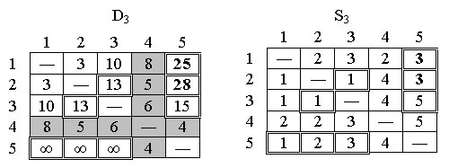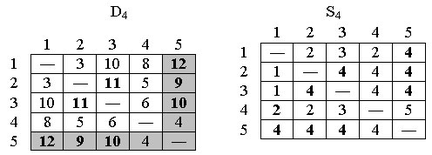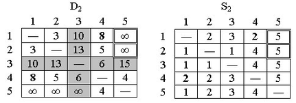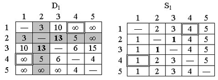 Конечные матрицы D4 и S4 содержат всю информацию, необходимую для определения кратчайших путей между любыми двумя узлами сети. Например, кратчайшее расстояние между узлами 1 и 5 равно d15 = 12.