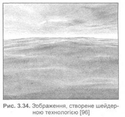 У 2001-2002 pp. для масового вжитку, в першу чергу для комп'ютерних ігор, почали виготовлятися відеоадаптери (nVidia GeForce3,. ATI Radeon 8500), які апаратно підтримують базові операції шейдерів. Розробники графічних програм зацікавилися гнучкими можливостями шейдерів, оскільки відчувалася обмеженість фіксованого набору процедур графічного конвейєра. Можливість програмування графічних процесорів дає новий поштовх розвитку засобів комп'ютерної графіки. На рис. 3.34 наведено приклад зображення хвиль, створеного за допомогою шейдерів.