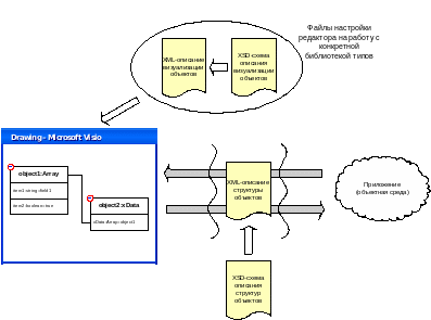 В процессе редактирования визуальные образы объектов заполняются данными, между объектами устанавливаются связи. Результат своей работы пользователь конструктора может сохранить либо в виде диаграммы Visio, т.е. в файле с расширением vsd, либо в XML‑файле описания структуры объектов, представляющем разработанную объектную модель (или её часть) в специально разработанном для этого XML‑языке. Vsd‑файл можно использовать лишь для дальнейшего конструирования модели в редакторе, в то время как XML‑представление может быть передано соответствующему приложению для изменения состояния объектной модели (рис. 1). Ясно, что такое приложение должно поддерживать API интерпретации XML‑языка описания объектной модели. Фрагменты модели для редактирования «поступают» от соответствующего приложения также в виде подобных XML‑документов.