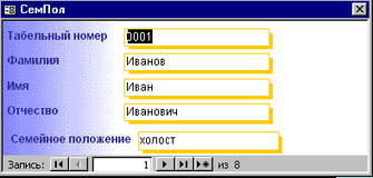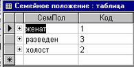 - Таблица «Семейное положение» с полями СемПолож и Код; (см. рис. 1.5.)