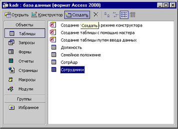 Для базы данных «Кадры» создаем таблицы в режиме «Конструктор». Нажимаем кнопку «Создать» на вкладке таблицы (см. рис. 2.1.) и выбираем пункт списка «Конструктор».