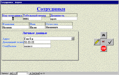 Форма «Сотрудники» служит для корректировки, ввода и удаления данных о сотрудниках. На форме имеются пять кнопок для удобной работы с БД: