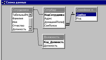 Например: таблица «Сотрудник» связана с таблицей «СотрАдр» по КодСотрудника связью 1 – к – 1, а таблица «Семейное положение» связана с таблицей «СотрАдр» связью 1 – ко – многим (см. рис. 1.8.)