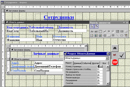 Для создания полей в форме используется панель элементов. Для определения свойств формы, полей, заголовков и т.д. используется окно свойства, где устанавливаются нужные параметры для каждого объекта.