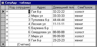 - Таблица «СотрАдр» с полями Код сотрудника, Адрес, ДомТелеф, СемПолож (см. рис. 2.4.)