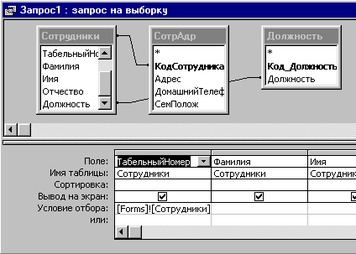 кнопка «Отобрать по должностям» активизирует запрос «Должн», который также создан в режиме конструктора с помощью таблиц «Сотрудники» и «Должность» (см. рис 1.21), причем поле «Должность» из таблицы «Сотрудники» не выводится на экран, но по нему выполняется запрос (см. рис.1.22).