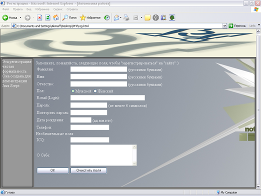 На данной странице выполняется регистрация посетителей. Для этого необходимо правильно заполнить обязательные поля: Фамилия, Имя, Отчество, Пол, E-Mail, Пароль, Подтверждение пароля, Дата рождения и Телефон, а также необязательные поля: ICQ и О Себе. Если вдруг посетителю понадобилось исправить всю информацию, то достаточно нажать кнопку “Очистить поля”.