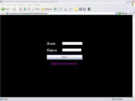 При правильном заполнении полей происходит переход на главную страницу. А если данное посещение является первым, то следует выбрать ссылку “Зарегистрироваться”. При этом открывается страничка регистрации reg.html.