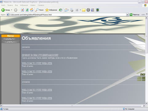 В данной расчётно-графической работе был разработан web-сайт, предоставляющий некоторую информацию о факультете информатики ВУиТ и его специальностях. В разработанном web-сайте организован аутентифицированный вход на сайт, регистрация посетителей, просмотр новостей, просмотр информации о факультете и специальностях.