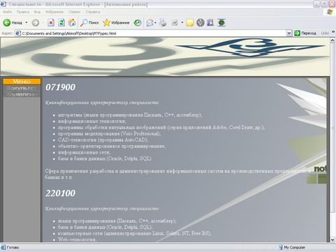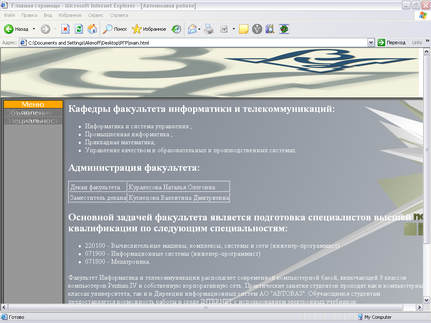 На главной страничке слева и снизу расположены ссылки на страницы spec.html и news.html. А чуть правее – информация о факультете.
