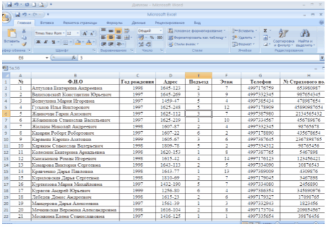 3.3 Создание базы данных в программе Microsoft Excel