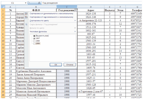 Устанавливаем фильтрацию по годам, например, ищем учеников с 1997 годом рождения (рис. 3.5).