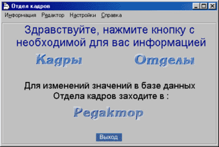 За допомогою її можна запускати вікна, як “Информация о кадрах”, “Отделы”, “Редактор базы данных - Отдела кадров”, “Настройки программы" не виходячи з них.