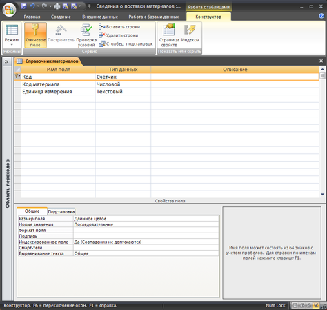 Рис. 4. Описание полей таблицы «справочник материалов»