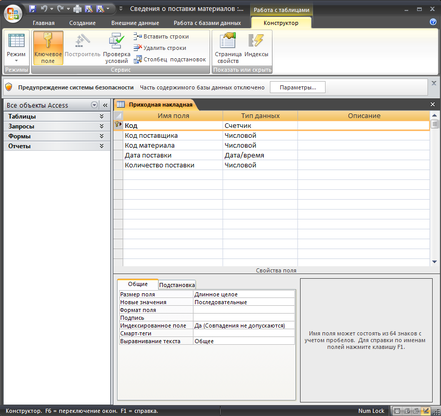 Создадим форму таблицы «Приходная накладная» с помощью конструктора таблиц.