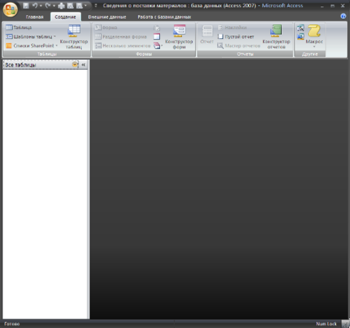 Нажимаем кнопку объекта «Запросы» в диалоговом окне с именем файла «Сведения о поставке материалов»:появится команда «Создание запроса в режиме конструктора»