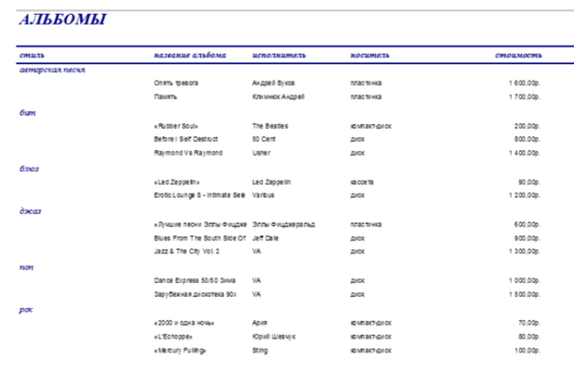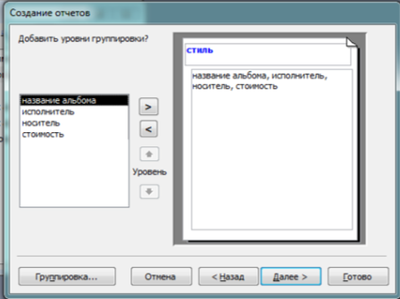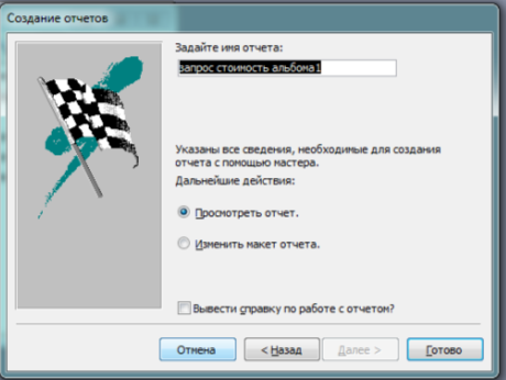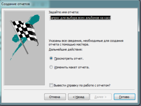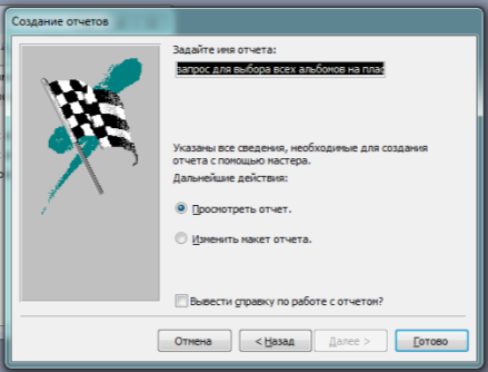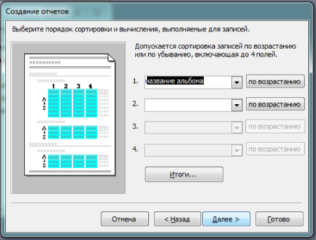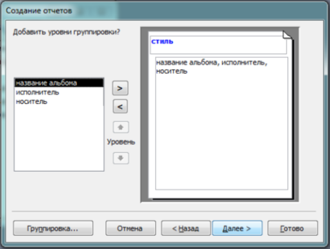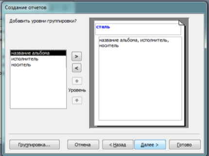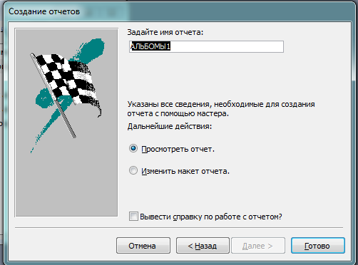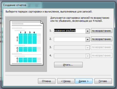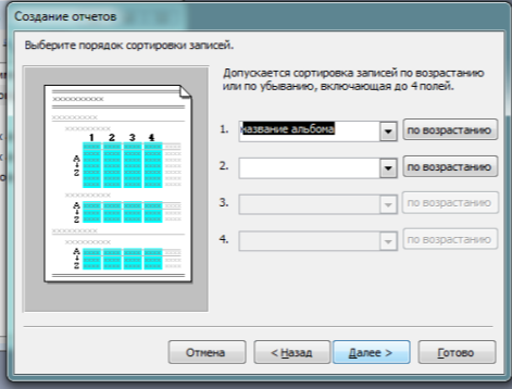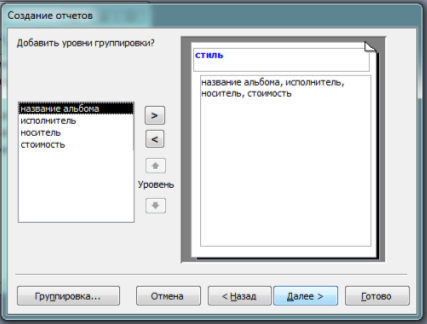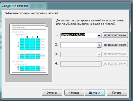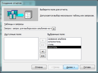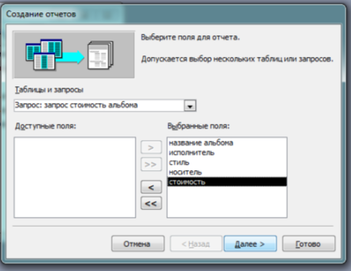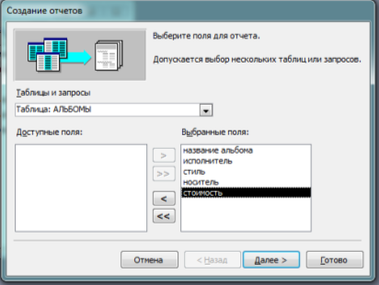 Создаю отчет по таблице альбомы. Выбираю таблицу альбомы и из доступных полей перекидываю данные в выборочные поля, нажимаю далее