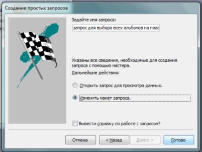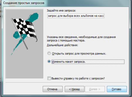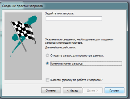 Задаю имя запроса и ставлю флажок на изменение макета запроса, нажимаю готово