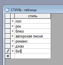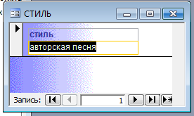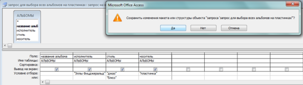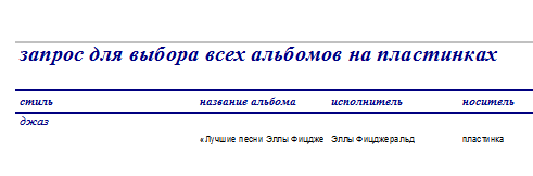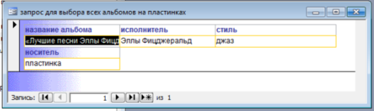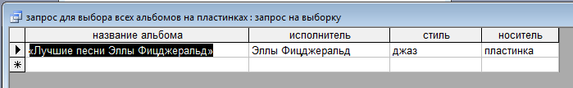 В поле условия отбора в столбце стиль указываю джаз и блюз, в столбце носитель – пластинка, в столбце исполнитель –Элла Фицджеральд . Сохраняю изменения макета.