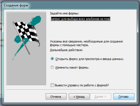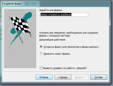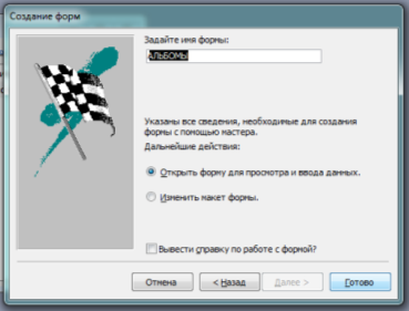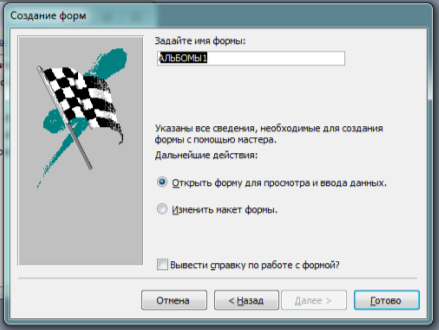Создаю форму по таблице альбомы. Выбираю таблицу альбомы и из доступных полей перекидываю данные в выборочные поля, нажимаю далее