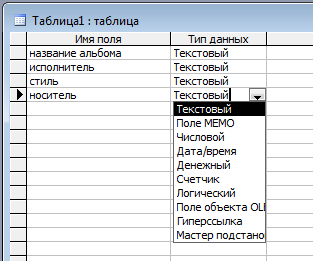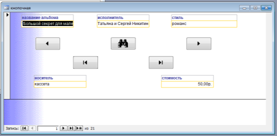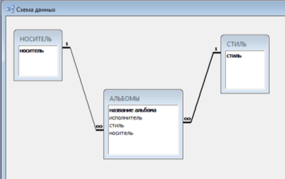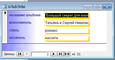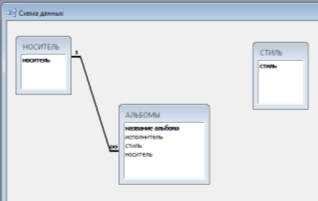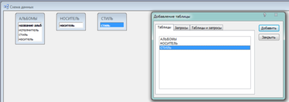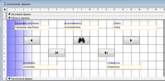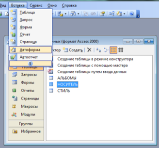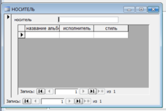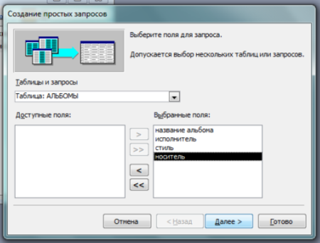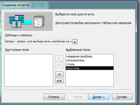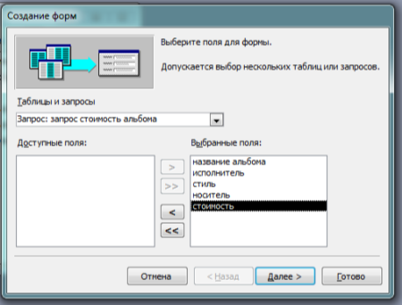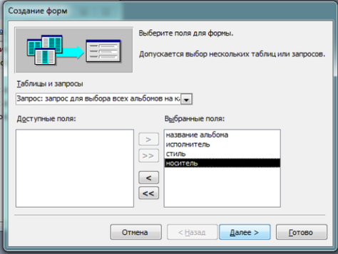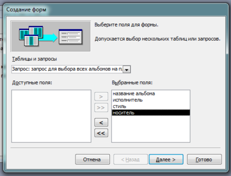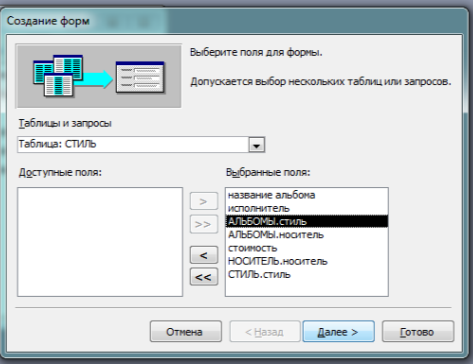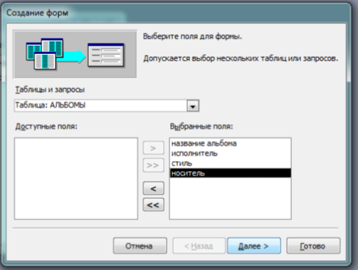 Создаю кнопочную форму по таблицам. Выбираю таблицу альбомы, носитель и стиль и из доступных полей перекидываю данные в выборочные поля, нажимаю готово
