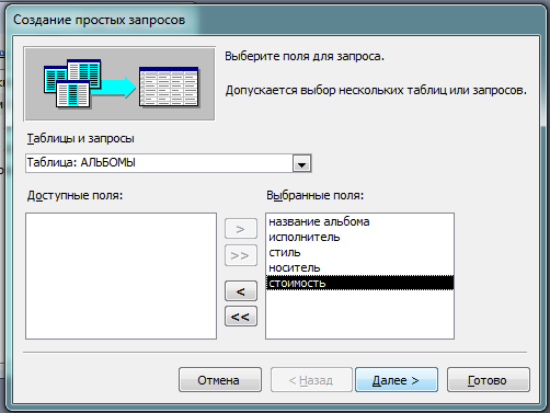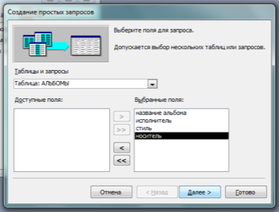 Выбираю таблицу альбомы, переношу все доступные поля в выбранные поля, нажимаю далее