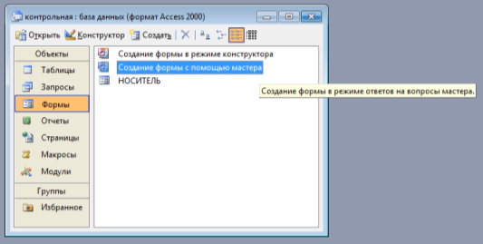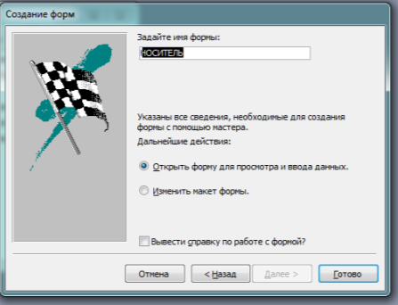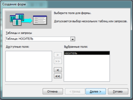 Создаю форму по таблице носитель. Выбираю таблицу носитель и из доступных полей перекидываю данные в выборочные поля, нажимаю далее