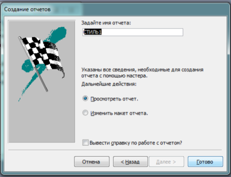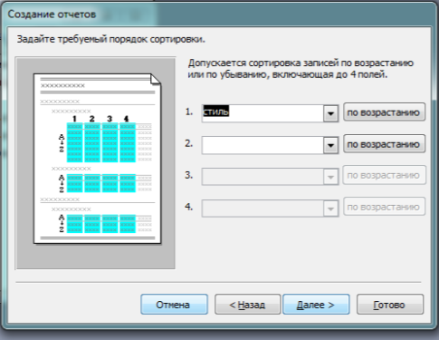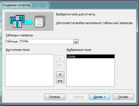 Создаю отчет по таблице стиль. Выбираю таблицу стиль и из доступных полей перекидываю данные в выборочные поля, нажимаю далее