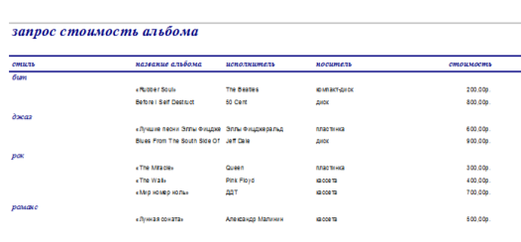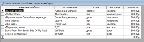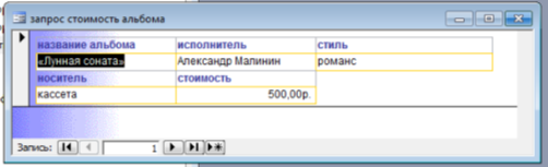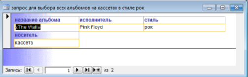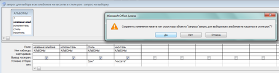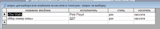В поле условия отбора в столбце стиль указываю рок, а в столбце носитель – кассета. Сохраняю изменения макета.