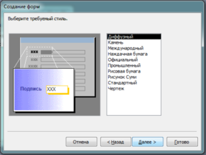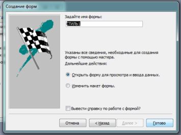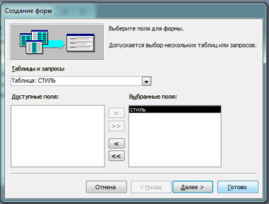 Создаю форму по таблице стиль. Выбираю таблицу стиль и из доступных полей перекидываю данные в выборочные поля, нажимаю далее