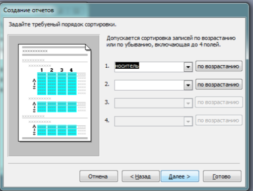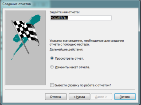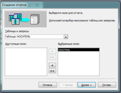 Создаю отчет по таблице носитель. Выбираю таблицу носитель и из доступных полей перекидываю данные в выборочные поля, нажимаю далее