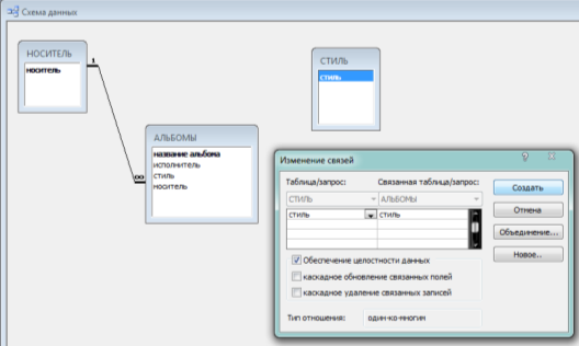 Создаю связь между таблицами стиль и альбомы. Выделяю строку стиль в таблице стиль и соединяю ее со строкой стиль в таблице альбомы. Появляется окошко изменение связей, ставлю флажок на обеспечение целостности данных и нажимаю создать