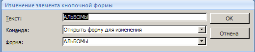 Нажимаю создать. В поле команда выбираю открыть форму для изменения, в поле форма – альбомы. Нажимаю ок