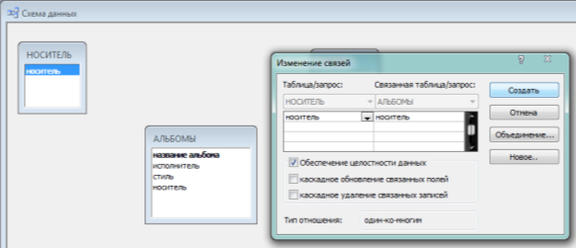 Создаю связь между таблицами носитель и альбомы. Выделяю строку носитель в таблице носитель и соединяю ее со строкой носитель в таблице альбомы. Появляется окошко изменение связей, ставлю флажок на обеспечение целостности данных и нажимаю создать