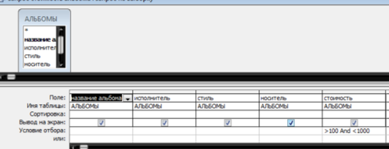 Создаю запрос для выбора стоимости альбомов от 100 до 1000. Выбираю таблицу альбомы и переношу из доступных полей в выбранные поля все данные и нажимаю далее