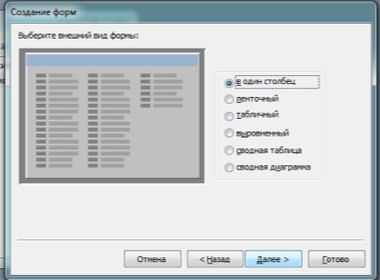 Создаю форму по запросу. Выбираю запрос и из доступных полей перекидываю данные в выборочные поля, нажимаю далее
