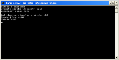 for (int j = 0; j { kod_c += putchar(stroka[j]);//код символа kol_c ++; } cout << endl << "Kolichestvo simvolov v stroke =" << kol_c << endl; cout << "Srednij kod =" << kod_c/kol_c << endl; // выдедение слова slovo = strtok(stroka, razd); int chislo= 0; while(slovo != NULL) { // обработка слов if (stricmp(slovo, "один")==0) { chislo += 1;} if (stricmp(slovo, "два")==0) {chislo += 2;} if (stricmp(slovo, "три")==0) {chislo += 3;} if (stricmp(slovo, "четыре")==0) {chislo += 4;} if (stricmp(slovo, "пять")==0) {chislo += 5;} if (stricmp(slovo, "шесть")==0) {chislo += 6;} if (stricmp(slovo, "семь")==0) {chislo += 7;} if (stricmp(slovo, "восемь")==0) {chislo += 8;} if (stricmp(slovo, "девять")==0) {chislo += 9;} if (stricmp(slovo, "десять")==0) {chislo += 10;} if (stricmp(slovo, "одиннадцать")==0) {chislo += 11;} if (stricmp(slovo, "двенадцать")==0) {chislo += 12;} if (stricmp(slovo, "тринадцать")==0) {chislo += 13;} if (stricmp(slovo, "четырнадцать")==0) {chislo += 14;} if (stricmp(slovo, "пятнадцать")==0) {chislo += 15;} if (stricmp(slovo, "шестнадцать")==0) {chislo += 16;} if (stricmp(slovo, "семнадцать")==0) {chislo += 17;} if (stricmp(slovo, "восемнадцать")==0) {chislo += 18;} if (stricmp(slovo, "девятнадцать")==0) {chislo += 19;} if (stricmp(slovo, "двадцать")==0) {chislo += 20;} if (stricmp(slovo, "тридцать")==0) {chislo += 30;} if (stricmp(slovo, "сорок")==0) {chislo += 40;} if (stricmp(slovo, "пятьдесят")==0) {chislo += 50;} if (stricmp(slovo, "шестьдесят")==0) {chislo += 60;} if (stricmp(slovo, "семьдесят")==0) {chislo += 70;} if (stricmp(slovo, "восемьдесят")==0) {chislo += 80;} if (stricmp(slovo, "девяносто")==0) {chislo += 90;} if (stricmp(slovo, "сто")==0) {chislo += 100;} if (stricmp(slovo, "двести")==0) {chislo += 200;} if (stricmp(slovo, "триста")==0) {chislo += 300;} if (stricmp(slovo, "четыреста")==0) {chislo += 400;} if (stricmp(slovo, "пятьсот")==0) {chislo += 500;} if (stricmp(slovo, "шестьсот")==0) {chislo += 600;} if (stricmp(slovo, "семьсот")==0) {chislo += 700;} if (stricmp(slovo, "восемьсот")==0) {chislo += 800;} if (stricmp(slovo, "девятьсот")==0) {chislo += 900;} //printf(" %s\n", slovo); // выделение очередного слова slovo = strtok(NULL, razd); } cout << "Chislo =" << chislo << endl; gets(stroka); return 0; } 2. Что такое константа? Приведите примеры типизированных и не типизированных констант C++ дает возможность записи значений основных типов: символьных констант, целых констант и констант с плавающей точкой. Кроме того, ноль (0) может использоваться как константа любого указательного типа, и символьные строки являются константами типа char. Можно также задавать символические константы. Символическая константа - это имя, значение которого не может быть изменено в его области видимости. В C++ имеется три вида символических констант: (1) любому значению любого типа можно дать имя и использовать его как константу, добавив к его описанию ключевое слово const; (2) множество целых констант может быть определено как перечисление; и (3) любое имя вектора или функции является константой. Типизированные константы можно сравнить с инициализированными переменными - переменными, значения которых определяются на входе в их блок. В отличие от нетипизированных констант в описании типизированной константы указывается как тип, так и значение константы. описание типизированной константы L->¦идентификатор+->¦ : +->¦тип+->¦ = +->¦типизированная+--> константа ¦ типизированная константа константа