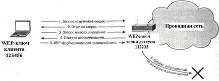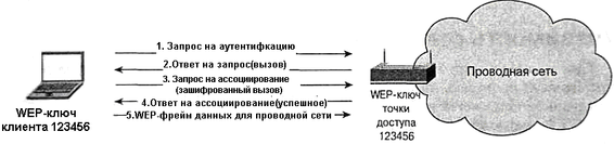 После выполнения открытой аутентификации и завершения процесса ассоциирования клиент может начать передачу и прием данных. Есликл иент сконфигурирован так, что его ключ отличается от ключа точки доступа, он не сможет правильно зашифровывать и расшифровывать фреймы, и такие фреймы будут отброшены как точкой доступа, так и клиентской станцией. Этот процесс предоставляет собой довольно-таки эффективное средство контроля доступа к BSS (рис. 5).
