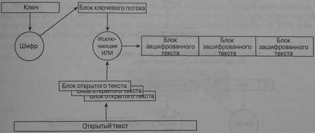 Блочный шифр, наоборот, генерирует единственный ключевой поток шифрования фиксированного размера. Открытый текст делится на блоки, и каждый блок смешивается с ключевым потоком независимо. Если блок открытого текста меньше, чем блок ключевого потока, первый дополняется с целью получения блока нужного размера. На рис. 2 проиллюстрирована работа блочного шифра. Процесс фрагментации, а также другие особенности шифрования с использованием блочного шифра вызывают повышенную, по сравнению с поточным шифрованием, нагрузку на центральный процессор. В результате производительность устройств, применяющих блочное шифрование, снижается.