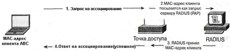 Аутентификация с использованием МАС-адресов не специфицирована стандартом 802.11. но обеспечивается многими производителями. В ходе аутентификации с использованием МАС-адресов проверяется соответствие МАС-адреса клиента локально сконфигурированному списку разрешенных адресов или списку, хранящемуся на внешнем аутентификационном сервере. Аутентификация с использованием МАС-адресов усиливает действие открытой аутентификации и аутентификации с совместно используемым ключом, обеспечиваемыми стандартом 802.11, потенциально снижая тем самым вероятность того, что неавторизованные устройства получат доступ к сети. Например, администратор сети может пожелать ограничить доступ к определенной точке доступа для трех конкретных устройств. Если все станции и все точки доступа BSS используют одинаковые WEP-ключи, при использовании открытой аутентификации и аутентификации с совместно используемым ключом такой сценарий реализовать трудно. Чтобы усилить действие механизма аутентификации стандарта 802.11, он может применить аутентификацию с использованием МАС-адресов.